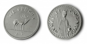 اما در مورد سوال دوم:من هم همون اوایل که شروع به خوندن مقاله کردم خیلی برام عجیب بود که چرا تارگرین ها روی سکه هاشون نقش گوزن میزنن و مثلا از اژدها استفاده نمیکنن.کمی که گذشت یه توجیه تقریبا قابل قبول پیدا کردم.(البته چرایی این موضوع همچنان در هیچ جایی ذکر نشده)و اون وقتی برام منطقی تر به نظر رسید که رسیدم به سکه هایی که ادارد ضرب میکرد.چرا که نقش روی سکه های ادارد دایرولف بود اما درنامگذاریش از واژه ی PFENNIG استفاده کرد و برای راهنمایی تو پرانتز HALF-STAG رو بکار برده.من فکر میکنم که واژه ی STAG-ی که توی سکه ها استفاده میشه جدا از نماد گوزنیه که براتیون ها استفاده میکنند و میتونه نقش یه واحد پولی رو بازی کنه.(البته بازم میگم این تنها استنباط منه)