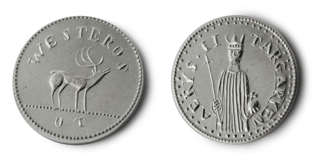 قطعه ای کوچک و نقره ای معروف به “گوزن”. ضرب این سکه پس از فتوحات اگان فاتح انجام شده است. در روی سکه تصویر حکاکی شده ی اگان فاتح را میبینید. در دو طرف پرتره ی اگان تصاویر دو خواهر او یعنی ویسینیا Visenya و رینیس Rhaenys حکاکی شده است. کار حکاکی و طراحی این سکه توسط سکه شناس و حکاک ماهری به نام Gregory Franck-Weiby انجام شده است. ایده ی Gregory این بود که این ۳ سر را در کنار هم قرار دهد و گیسوان آنها را بصورت یکپارچه طراحی کند. اگان فاتح تاجی بر سر نهاده که نقشی از سر ۳ اژدها بر آن تصویر شده است. اینکه روی تاج اگان سه اژدها طراحی شده، بیانگر این حقیقت است که که ۳ خواهر و برادر تقریبا به شکل واحد حکومت میکردند.
