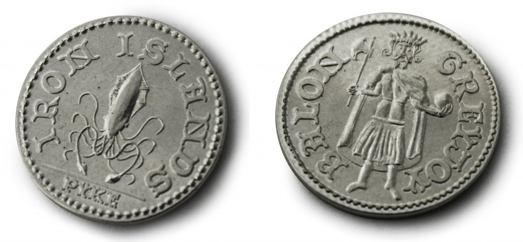 در روی سکه تصویری از بالون گریجوی را میبینیم در حالیکه ایستاده و در یک دستش تبر و در دست دیگرش مرواریدی بزرگ قرار دارد که دلالت بر قدرت دریاست. در آن سوی سکه تصویری از کراکن-هیولای بزرگ دریا که توانایی فروکشیدن کشتی ها را به اعماق دریا را دارد-حکاکی شده است. کراکن نماد خاندان گریجوی هاست. بر روی سکه های قدیمی تر تاریخی درج نشده است اما از زمان مرگ رابرت براتیون (در سال ۲۹۸ پس از فتوحات اگان) بر روی تمام سکه ها تاریخ درج میشود و علامت ضرب سکه ها بیانگر این مطلب است که این سکه ها در پایک Pyke ضرب شده اند.