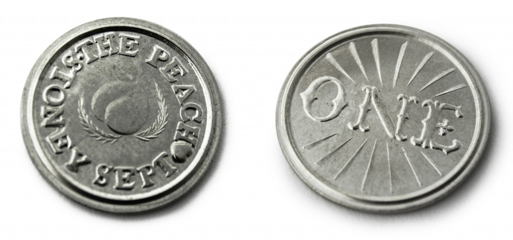 هدف از ترسیم میوه ی هلو در قسمت جلویی این سکه این است که به صورت نمادین شکلی شهوانی را در ذهن افراد ایجاد کند. در قسمت پشتی این سکه تنها کلمه ی ONE درج شده است. این سکه ها معمولا در مکانهای بخصوصی (فاحشه خانه ها) وجود داشتند و توسط نرخ رایج (یک گوزن) از مدیریت فاحشه خانه خریداری میشدند تا بعنوان مجوزی باشد برای ورود به فاحشه خانه و سپس انتخاب یک فاحشه. در نهایت سکه به فاحشه داده میشد. و فاحشه نیز آن را به مدیریت بازمیگرداند تا گواهی باشد برای خدمت به مشتری.