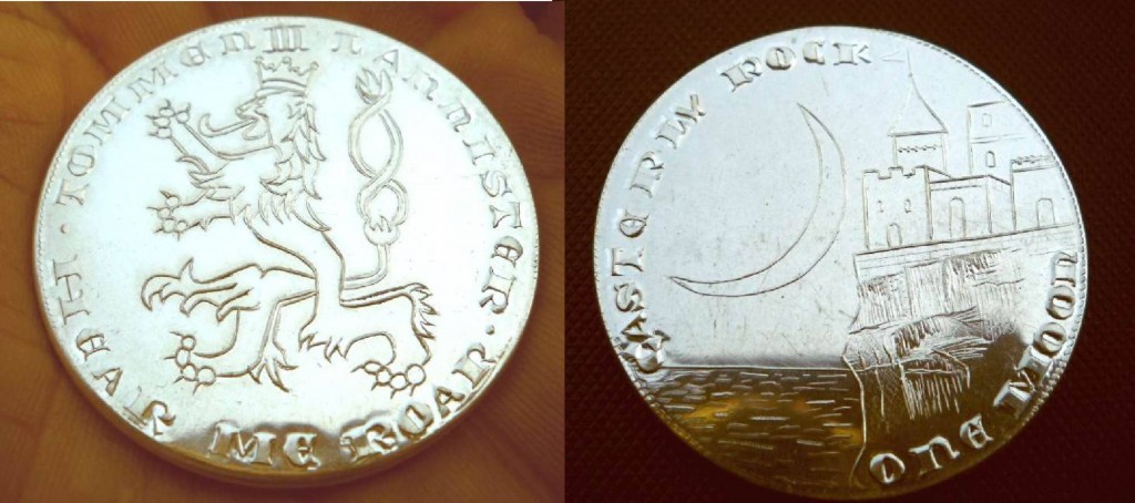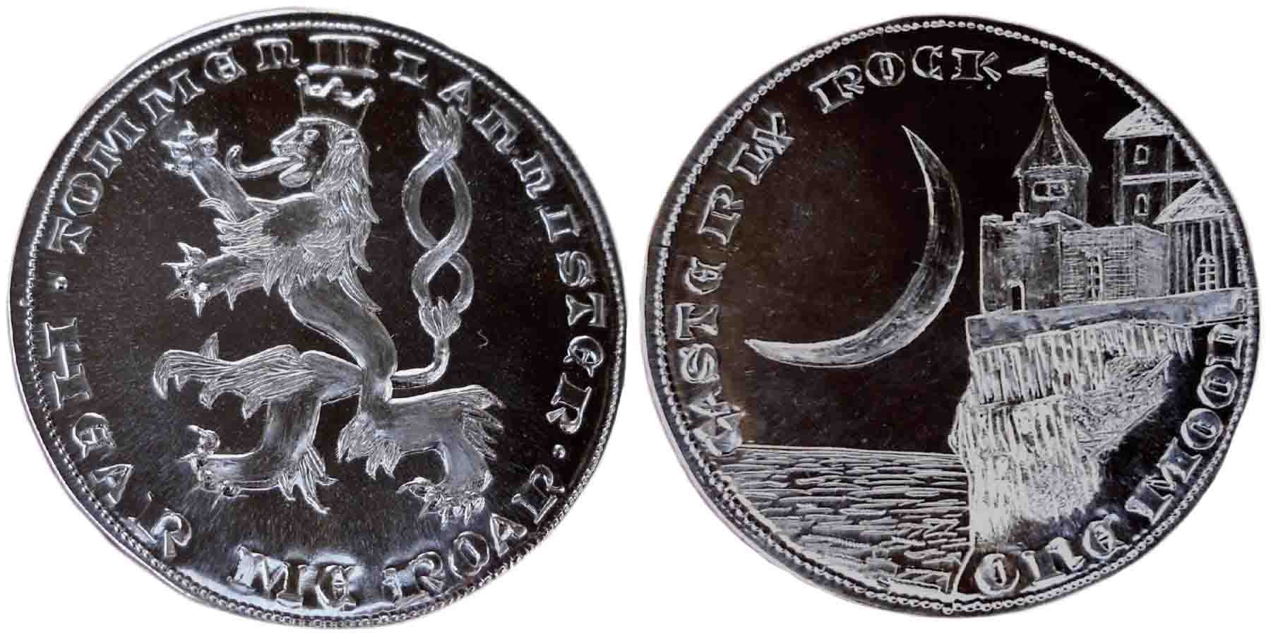 در روی این سکه یک شیر حکاکی شده است در حالی که روی سرش تاجی قرار داده شده است. شیر نماد خاندان لنیسترهاست. دور تا دور این شیر نام پادشاه تامن دوم لنیستری TOMMEN II LANNISTER و شعار معروف لنیسترها HEAR ME ROAR (غرش مرا بشنوید) حک شده است. در آنسوی سکه تصویری از کسترلی راک و دریا با یک هلال ماه حکاکی شده است. در بالا و پایین این تصویر نیز عبارات «کسترلی راک» و «۱ ماه» ذکر شده است.