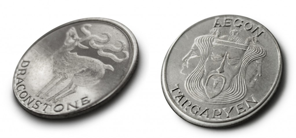 طراحی این سکه ی مرموز آهنی براساس داستانی افسانه ای به نام نغمه ی یخ و آتش است. این سکه های مرموز نقش مهمی را در این مجموعه بازی میکنند. زمانی که آریا استارک به ماجراجویی در خاک وستروس مشغول بود؛ به این سکه رسید درحالیکه آن را سکه ای بی ارزش میپنداشت. همانطور که در جریانات شاهد آن بودید این سکه از آن سکه های معمول و رایج نیست. بلکه نشانه ای ست برای به رسمیت شناختن اعضای گروهی که به «مردان بی چهره» معروفند. انجمنی مخفی مانند مافیا که برای ترور آموزش دیده اند. کسانی که با استفاده از آموزشهای دقیق و نوعی سحر و جادو توانایی تغییر چهره ی خود را دارند. آنها هر کاری را انجام میدهند به شرط اینکه بهای آن را پرداخت کرده باشید. در این مجموعه داستان، اگر کسی این سکه را به شما بدهد و کلمه ی «والار مورگولیس» Valar Morghulis (به معنی: همه فناپذیر هستند)را بر زبان آورد؛ شما نیز باید پاسخ مناسب را بر زبان آورید: «والار دوهاریس» Valar Dohaeris (به معنی: همه باید خدمت کنند) تا زنده بمانید. البته آریا نیز در طول داستان به اهمیت این سکه پی خواهد برد!