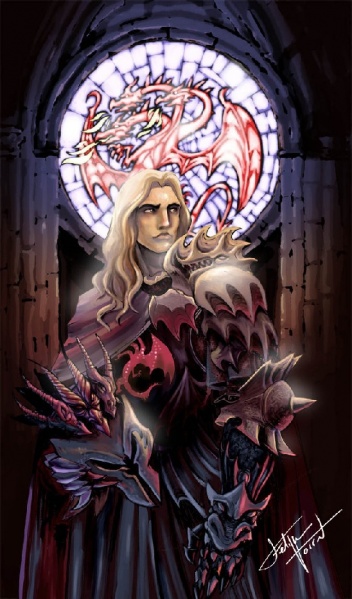 ریگار تارگرین، هفده ساله و تازه شوالیه شده، وقتی وارد میدان نبرد شد، روی زره زنجیری طلایی، زره فلزی سیاه پوشیده بود. در پشت کلاهخودش نوارهای قرمز و طلایی و نارنجی مانند شعله های آتش شناور بود. دو تا از عموهای سرسی، همین طور دو جین از بهترین نیزه باز های پدرش، زبده ترین های غرب، در مقابل نیزه ی ریگار به زمین افتادند،. شب هنگام، پرنس چنگ نقره ای اش را نواخته و اشک از چشمان سرسی جاری شده بود. سرسی (Cersei) وقتی به ریگار معرفی شد، تقریباً در عمق چشمان ارغوانی و غمگین او غرق شده بود. او زخمی بود، سرسی اندیشه هایش را به یاد آورد، اما وقتی ازدواج کردیم، من جراحتش را التیام خواهم داد. حتی جیمی (Jaime) زیبایش هم در مقایسه با ریگار، بیش از پسرکی خام نبود.[۹][/spoiler]