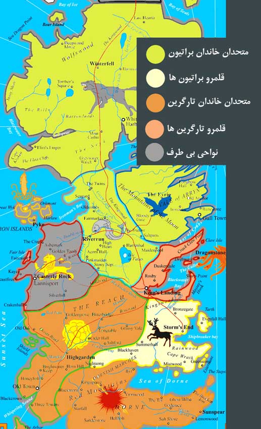 نمایش عملکرد خاندان ها از طریق رنگ: براتیون. استارک. تایرل. لنیستر. تارگرین