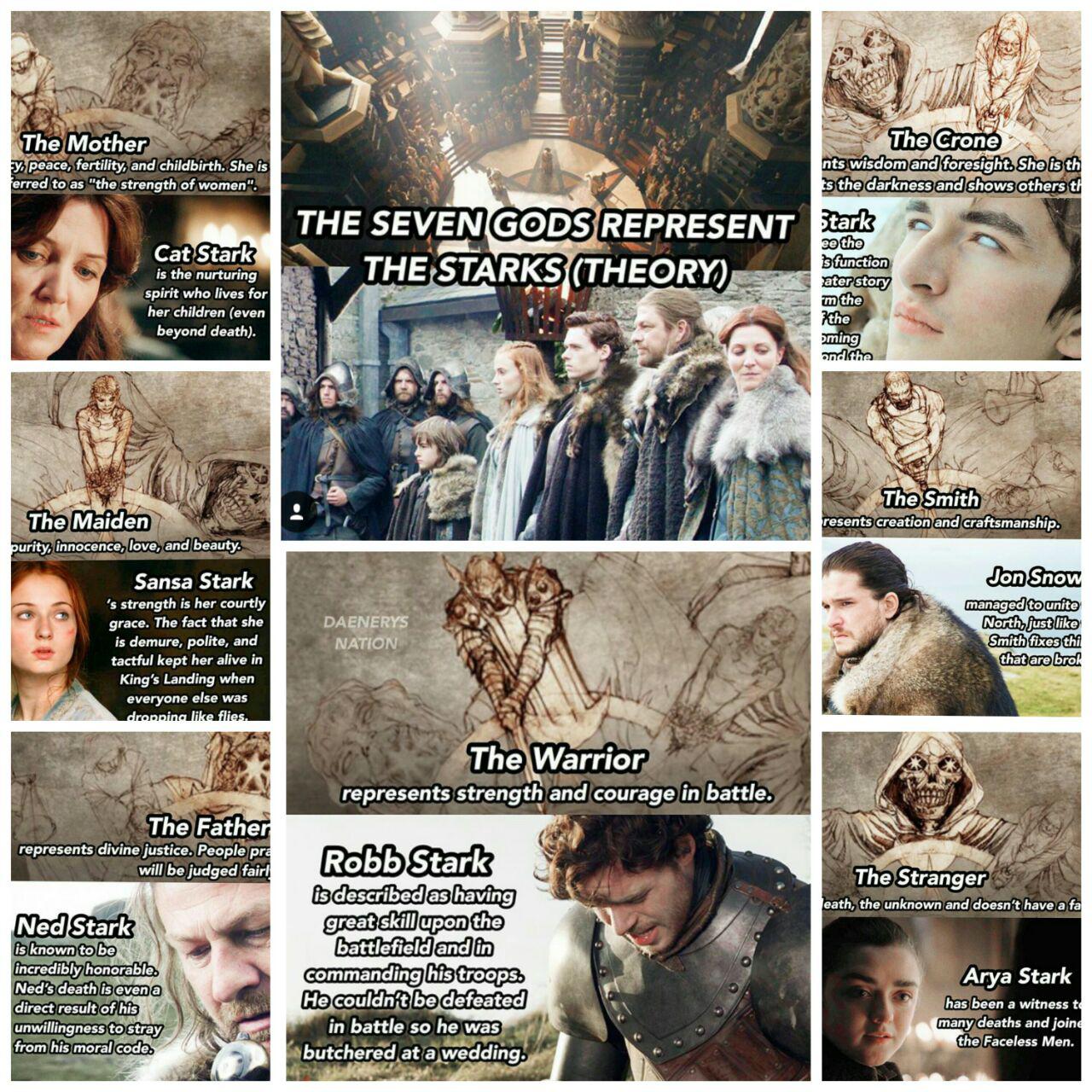 پدر-لرد ادارد استارک: در تعلیمات مذهب هفت از پدر به عنوان نماینده عدالت شناخته میشود موضوعی که کاملا برای گرگ آرام ادارد استارک صدق کرده و به نوعی درکنار بحث شرافت،عدالت نیز به صفت ثانویه این کرکتر تبدیل شده. در موارد گوناگونی میتوان به وضوح مشاهده کرد که لرد ادارد برای اجرای عدالت حتی مجبور میشود زندگی خودش را به خطر بیاندازد. همین ویژگی وی را به بهترین و شبیه ترین کرکتر نزدیک به پدر تبدیل میکند.