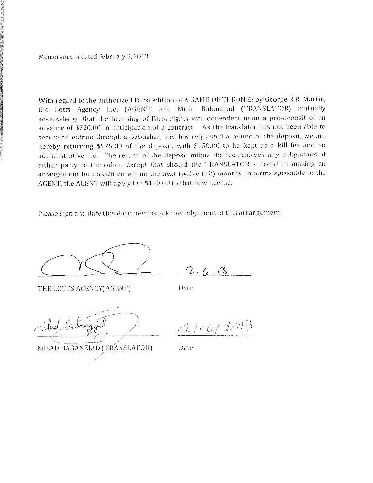برای اطلاعات بهتر شما توافقنامه فسخ با ایجنسی جرج آر آر مارتین و ایجنت ایشون کریس لاتس به همراه اعلام خود آقای مارتین در وبلاگش رو میذارم.»