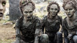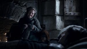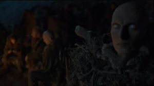 «او پسران را به خدایان میدهد. وایت می آید و او اینکار را میکند. اخیرا بیشتر می آید و به همین خاطر او به آنها گوسفند می دهد. حالا گوسفند دیگری باقی نمانده. بعدی احتمالا سگها هستند، تا …» او نگاهش را به پایین انداخت و شکمش را گرفت: «کدام خدایان؟ خدایان سرد.» (نزاع شاهان، جان)