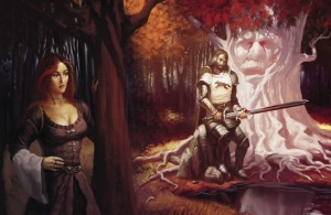 شوالیه درخت خندان (Knight of the Laughing Tree) روی سپرش طرحی از درخت نیایشی با صورتی خندان داشت.[۴]