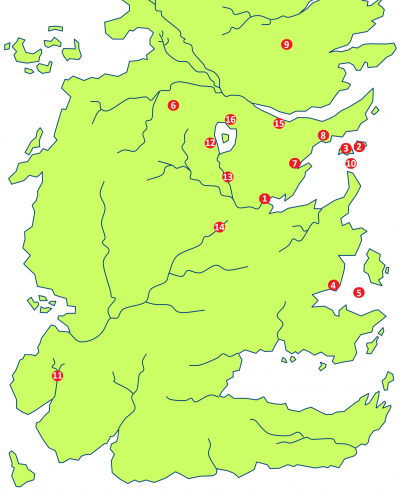 ۱.تاجگذاری اگان؛ سقوط بارانداز پادشاه۲ .دراگون استون۳ .دریفت مارک،شامل هوا و های تاید ۴.استورمز اند ۵.رقص بر فراز خلیج شیپ بریکر۶ .نبرد در استون هج ۷.داسکن دیل ۸.نبرد روکط رست ۹.ایری ۱۰.نبرد در تنگه ۱۱.نبرد بر هانی واین ۱۲.نبرد در کنار ساحل دریاچه ۱۳.جنگ در پشته سنگی ۱۴.نبرد نخست تامبلتون/نبرد دوم تامبلتون ۱۵.میدن پول ۱۶.رقص بر فراز هارن هال