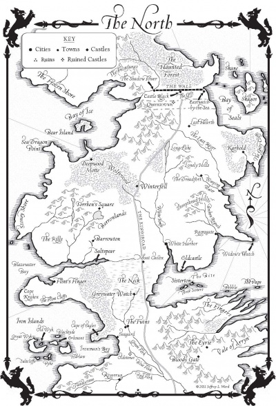 نقشه شمال در رقصی با اژدهایان (A Dance with Dragons) شامل تمام اطلاعات جغرافیایی داده شده از جنوب تا نک (the Neck) است.که توسط جفری ال.وارد گردآوری شده است.